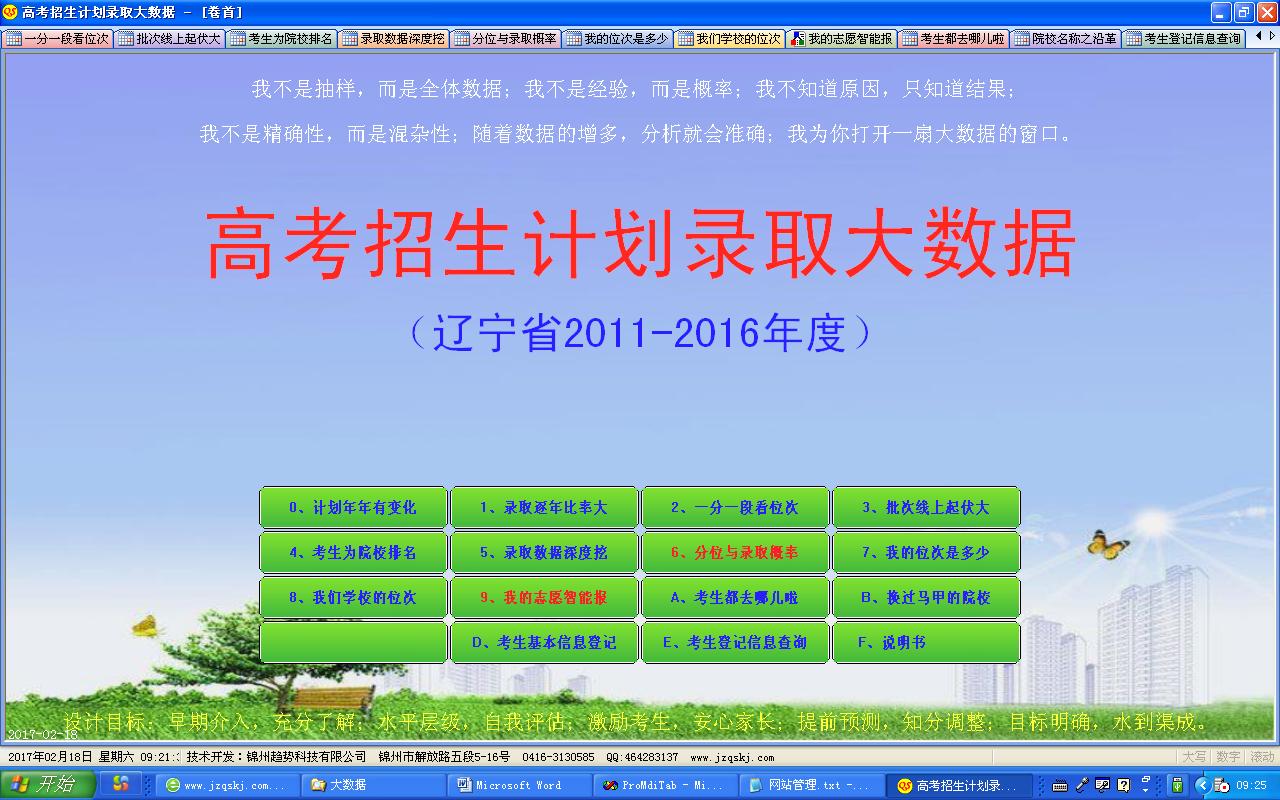 《高考大數據》簡介 錦州趨勢科技有限公司自本世紀初,即致力于云+大數據應用技術研發,已有多個行業、部門的大數據管理案例,積累了豐富的挖掘實戰經驗。 其中,遼寧高考大數據已經積累了自2008年以來招生計劃、高考錄取數據、分段表、院校錄取最低分、專業錄取最低分、院校補錄最低分、專業補錄最低分、院校補錄計劃等相關數據。 近十年來不斷探索、創新,已......